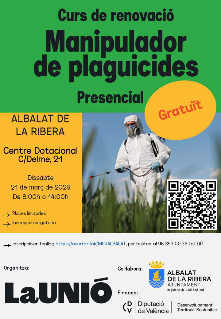 ALBALAT DE LA RIBERA.- Curs gratuït de renovació de manipulador de plaguicides.