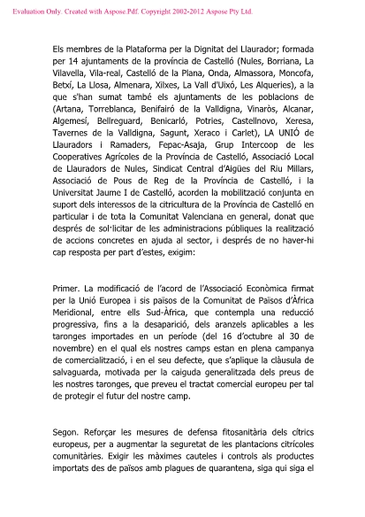 En el archivo adjunto se encuentra el manifiesto reivindicativo consensuado en el que se pide la modificación del acuerdo firmado con Sudáfrica, la aplicación inmediata de la cláusula de salvaguardia, exigir la reciprocidad a las producciones de países terceros, el cumplimiento de la Ley de la Cadena Alimentaria y la urgencia de conceder ayudas directas.