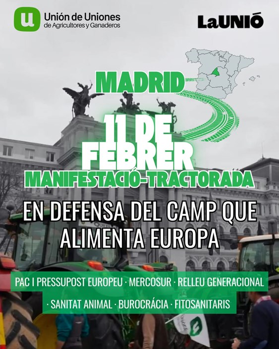 Per tots aquests motius, i muchos otros que es desprenen d'ells, centenares de llauradors i ramaders de LA UNIÓ, procedentes de toda la Comunitat Valenciana, participarán en la gran tractorada del próximo 11 de febrero a Madrid.