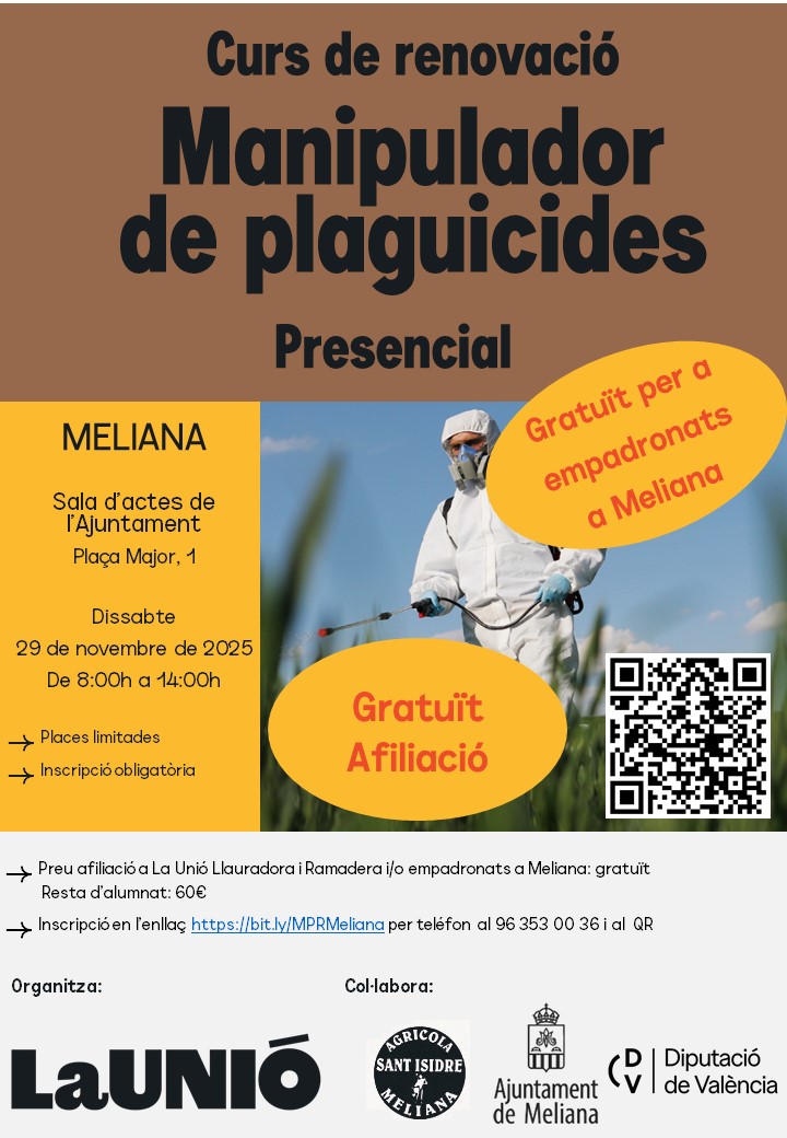 El curso es gratuito para la afiliación a LA UNIÓ y para empadronados en la localidad de Meliana, tiene una tarifa de 60 € para el resto de agricultores y ganaderos.